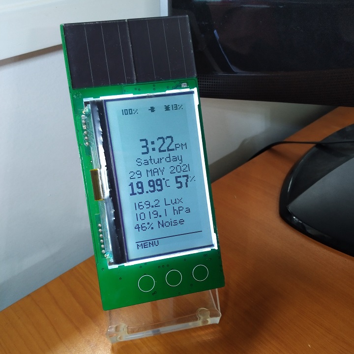 Featuring a large 128x64 matrix LCD and solar energy harvesting, this datalogger is USB connected and has 32MB of on-board flash memeory. Built-in sensors include temperature, humidity, barometic pressure, ambient light and ambient noise, with an expansion port exposing analog/digital GPIO, I2C and SPI.