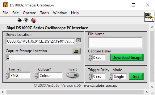 Built with LabVIEW 2020 this instant screen downloader works with Rigol DS1000Z and DG1000Z series oscilloscopes and function generators. It offers instant or delayed screen capture and the ability to have a time-delayed single or stop acquisition mode which is invaluable when hand-probing.