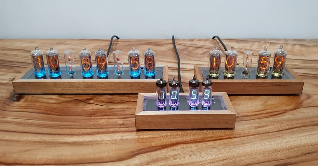 Combining a hand-craftred Tassie Oak frame, laser-cut acrylic, and Soviet display tubes, NIX labs designs and manufacturers these nixie clocks in Brisbane, Australia. Featuring a USB setup webapp, WiFi with Alexa/Google integration and a supercap time/date backup, they fuse retro display technology with a modern design.