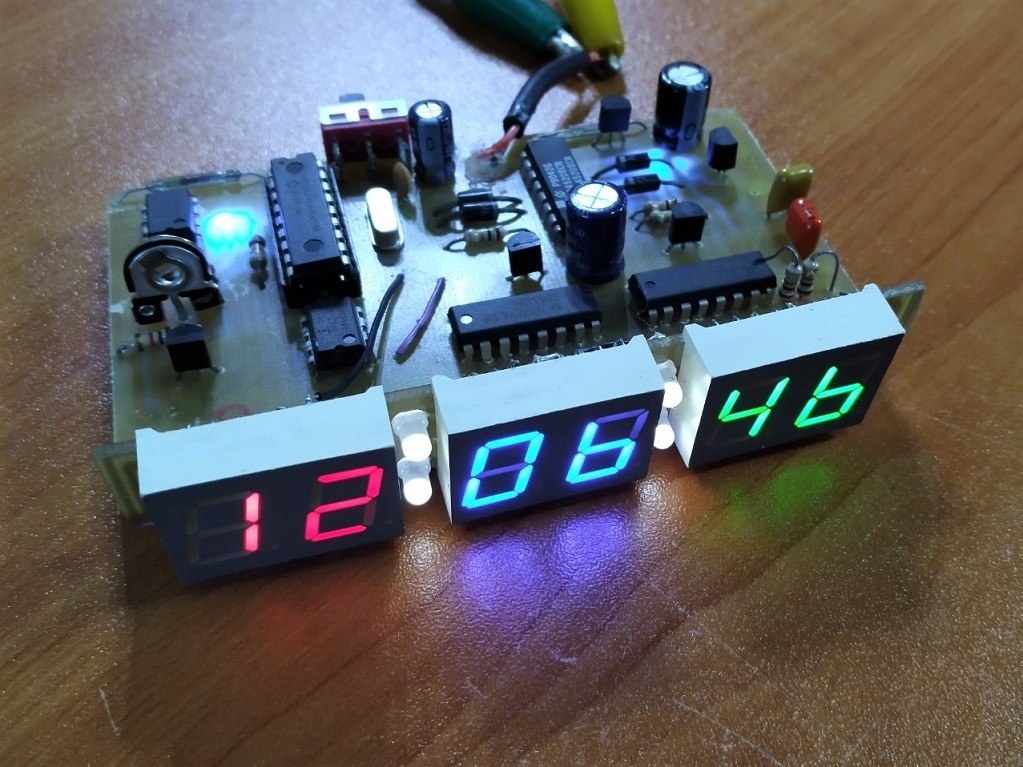 An early project, this colourful clock shows 24-hour time with automatic night-time dimming.